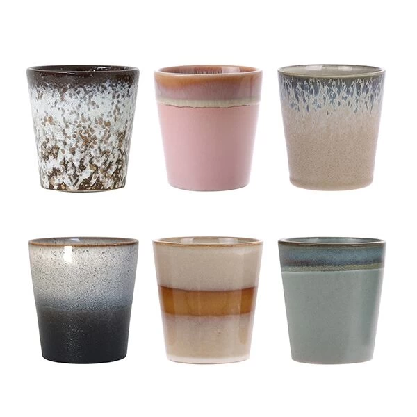 De HK Living 70’s mokken zijn gemaakt van gekleurd geglazuurd aardewerk. Een mok heeft een inhoud van 200 ml, een diameter van 7,5 cm en is 8 cm hoog. Het aardewerk is magnetronbestendig, hierdoor kunt u dranken in de mok in de magnetron opwarmen. Gebruik de HK Living 70’s mok voor het serveren van warme of koude dranken. Deze set bestaat uit de mokken: Mud, Rock, Moss, Snow, Pink, Bark.