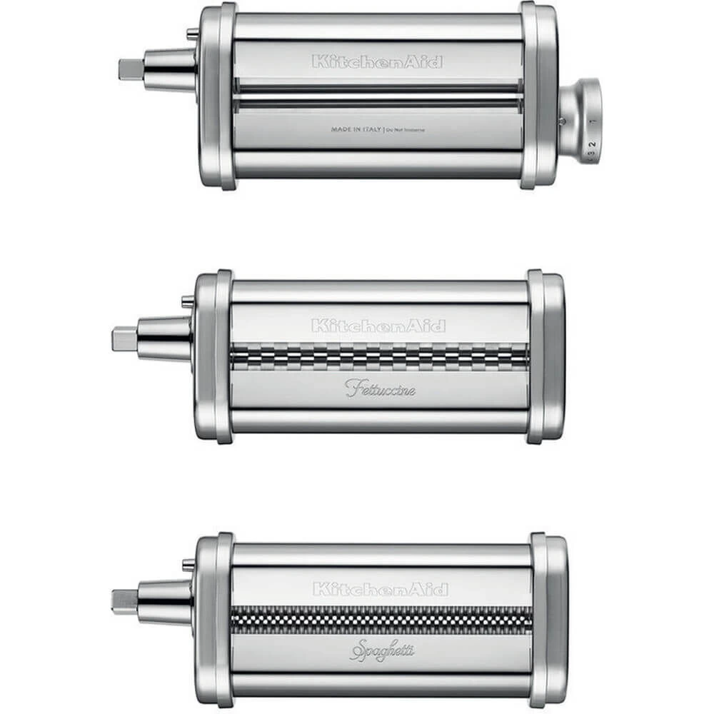 De driedelige KitchenAid pastaroller en –snijderset bestaat uit een pastaroller met instelbare dikte voor het maken van deegvellen, een snijroller voor fettuccine en een snijroller voor het maken van spaghetti. Elk van de drie accessoires uit de set is volledig gemaakt uit roestvrij staal, inclusief de deeg- en snijrollen zelf. Bij de pastaroller en –snijderset wordt een schoonmaak borsteltje meegeleverd. De KitchenAid pastaset bestaat uit de volgende delen: