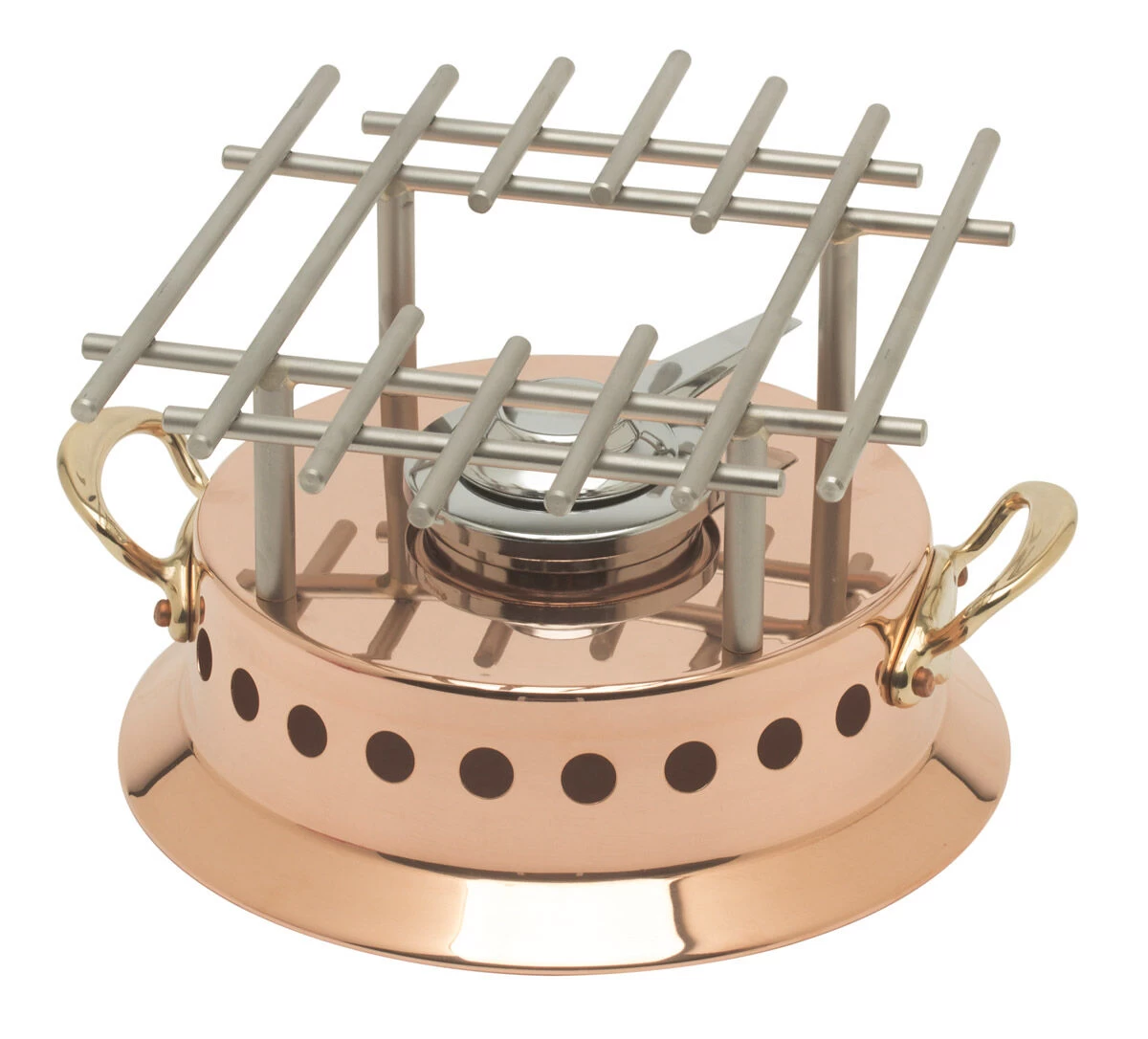 De koperen rechaud van Mauviel heeft een diameter van 22 cm en een hoogte van 17 cm. Het rechaud is geschikt om op tafel uw eten, zoals bijvoorbeeld flensjes, te flamberen. Het rooster is gemaakt van roestvrij staal, de behuizing van koper en het rechaud is voorzien van bronzen grepen.