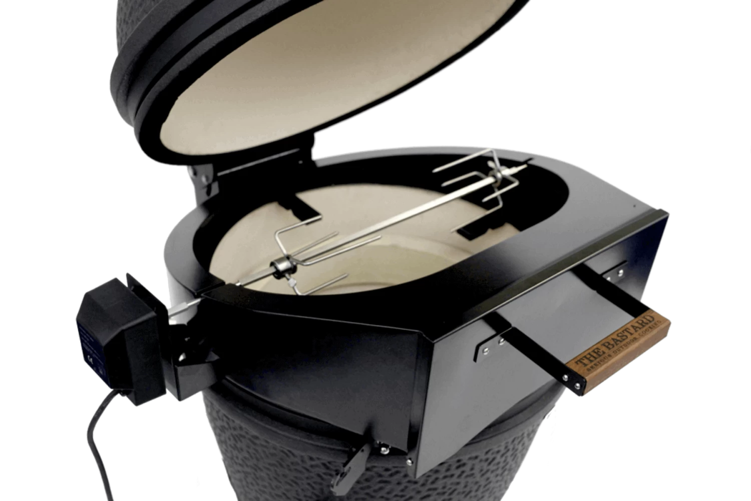Met de The Bastard pizza-rotisserie kunt u zowel grote stukken vlees draaiend en gelijkmatig garen als knapperige pizza’s bakken. De accessoire is gemaakt van dubbelwandig materiaal wat zorgt voor een goede warmte-isolatie.